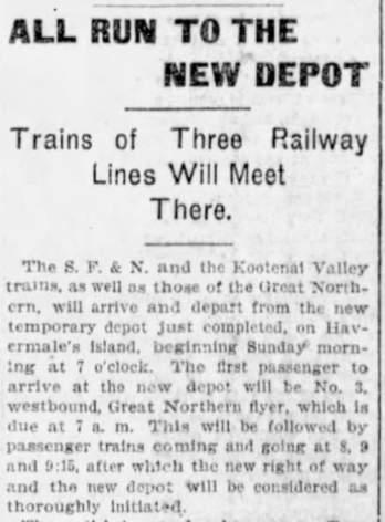 Spokesman-Review 14 June 1901“The SF&N and the Kootenai Valley trains, as well as those of the Great Northern, will arrive and depart from the new temporary depot just completed, on Havermale’s Island, beginning Sunday morning at 7 o’clock.”