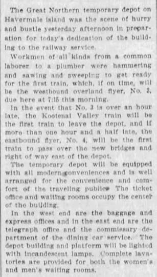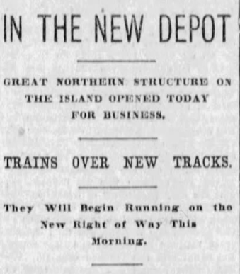 “The Great Northern temporary depot on Havermale Island was the scene of hurry and bustle yesterday afternoon in preparation for today’s dedication of the building to the railway service.”