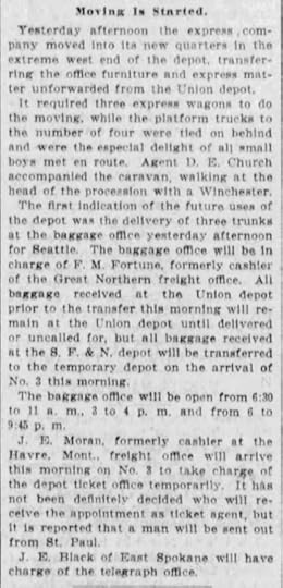 “Work on the second floor of the new Great Northern depot is progressing well, and the Great Northern officials expect to be able to move the general offices of that road within a couple of weeks or shorter time.”