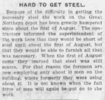 Amidst news of McKinley’s death: “Because of the difficulty in getting the necessary steel the work on the Great Northern depot has been greatly hampered since about the first of August.”
