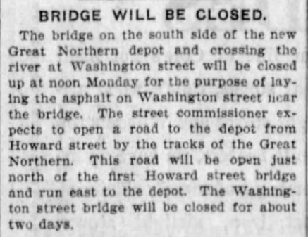 “The Bridge on the south side of the new Great Northern depot and crossing the river at Washington street will be closed up at noon Monday for the purpose of laying the asphalt on Washington street near the bridge.”