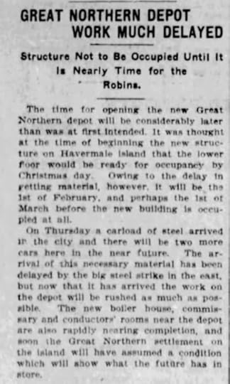 “Great Northern Depot Work Much Delayed: Structure not to be occupied until it is nearly time for the robins.… The time for opening the new Great Northern depot will be considerably later than was at first intended. It was thought at the time of beginning the new structure on Havermale Island that the lower floor would be ready for occupancy by Christmas day. Owing to the delay in getting material, however, it will be the 1st of February, and perhaps the 1st of March before the new building is occupied at all.… On Thursday a carload of steel arrived in the city and there will be two more cars here in the near future. The arrival of this necessary material has been delayed by the big steel strike in the east, but now that it has arrived the work on the depot will be rushed as much as possible. The new boiler house, commissary and conductors’ rooms near the depot are also rapidly nearing completion, and soon the Great Northern settlement on the island will have assumed a condition which will show what the future has in store.”