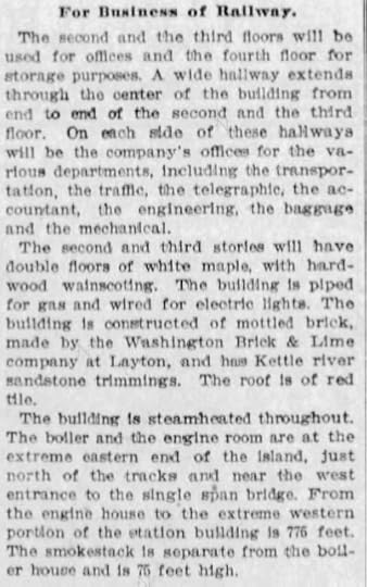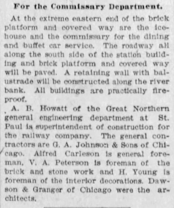 Thomas refers to this article about the Great Northern depot: “finest depot building west of St. Paul.”