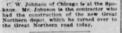 Chronicle 1 July 1902“CW Johnson of Chicago is at the Spokane. Mr. Johnson is the contractor who had the construction of the new Great Northern depot, which he turned over to the Great Northern road today.”