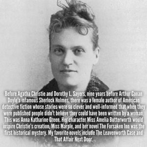 Before Agatha Christie and Dorothy L. Sayers, nine years before Arthur Conan Doyle’s infamous Sherlock Holmes, there was a female author of American detective fiction whose stories were so clever and well-informed that when they were published people didn’t believe they could have been written by a woman. This was Anna Katharine Green. Her character Miss Amelia Butterworth would inspire Christie’s creation, Miss Marple, and her novel The Forsaken Inn was the first historical mystery. My favorite novels include The Leavenworth Case and That Affair Next Door.