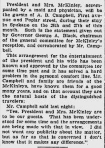 President McKinley’s visit to Spokane and all the references to the newspaper articles and facts regarding his visit in Cupboards All Bared are true, most of them taken straight out of The Spokesman. The McKinley Reception Committee was formed and headed by Chairman George A. Black. There was much planned for his visit in the manner of parades and speeches.