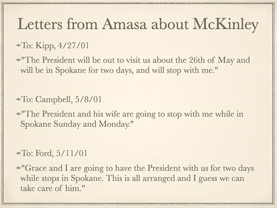 President William McKinley was scheduled to visit Spokane and stay with the Campbells a couple weeks after the events of my first book! This led to some rearranging. I didn’t want the events in the books to happen one right after the other, so I came up with a plan.