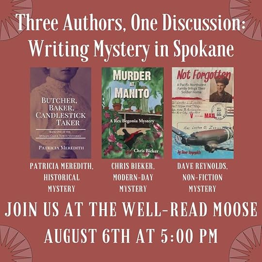 Saturday, August 6 at 5:00 p.m. join local authors Patricia Meredith, Chris Bieker, and Dave Reynolds in a discussion of what it’s like to write Spokane mysteries at the Well-Read Moose in Coeur d’Alene!