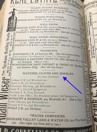 The list of watchmakers Archie visits is taken from the Polk’s City Directory from 1901 and are exactly as listed.