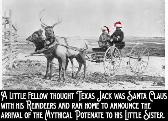 Dr. Carver and Texas Jack were the centre of attraction to the boys this morning until the elks appeared on the streets and then the doctor and his companion sank into mere nothingness in comparison with the horny-headed quadrupeds. A little fellow thought Texas Jack was Santa Claud with his reindeer and ran home to announce the arrival of the mythical potentate to his little sister. A farmer who was looking at the elks with all the eyes he possessed, viz. three pair in all, one natural and two of glass thought "by hokey, they would plow well."