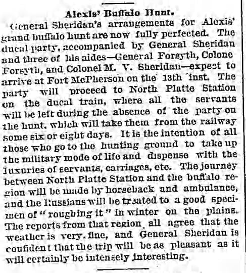 General Sheridan's arrangements for Alexis' grand buffalo hunt are now fully perfected. The ducal party, accompanied by General Sheridan and three of his aides—General Forsyth, Colonel Forsyth, and Colonel M.V. Sheridan—expect to arrive at Fort McPherson on the 13th inst.