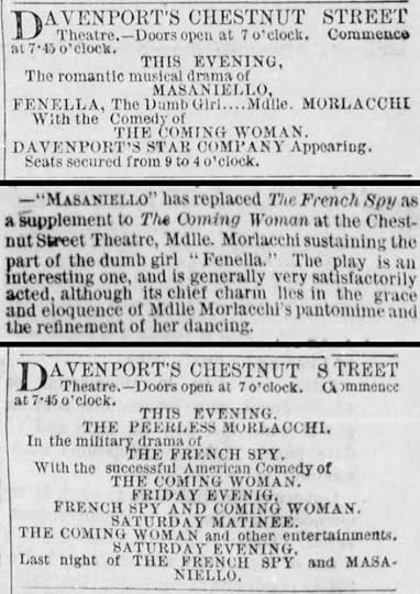 Meanwhile, Giuseppina Morlacchi's troupe was entertaining the city of Philadelphia at the Chestnut Street Theatre, where she was starring in the dramas Masaniello and The French Spy, as well as the comedy The Coming Woman. The Philadelphia Inquirer newspaper reported that the shows were interesting, but noted that the "chief charm lies in the grace and eloquence of Mddle Morlacchi's pantomime and the refinement of her dancing."