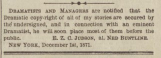 A note on the last page of the January 1st issue of Street & Smith's New York Weekly notified readers that E.Z.C. Judson, writing as Ned Buntline, was working with an "eminent dramatist" to turn his stories into plays, which he would" soon place ... before the public."