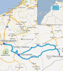 Flight to Marrakech2 days in Marrakech. Visit the souk and the medina, the palaces and gardensDrive through the high Atlas mountainsVisit Ait Ben Haddou, Unesco World Heritage siteStay in Morocco's Hollywood - Ouarzazarte - visit Atlas StudiosTravel via the Valley of the Roses to stay in Tinghir and visit a traditional Berber villageVisit the Todra GorgeTravel to MerzougaBook overnight stay in Sahara and the desert camp at Erg ChebbiTake a long drive back to Marrakesh or drop down to Agadir