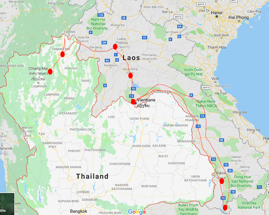 Chiang Mai - 2 daysChiang Rai 3 days including day trip to Golden Triangle border area of ThailandMekong Cruise from Laos border - 2 daysLuang Prabang - 3 daysVeng Vieng - 3 daysVentiane - 2 daysPakse - 1 dayIslands of Mekong - 3 days