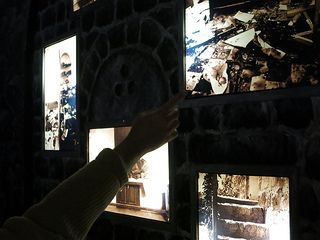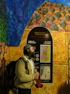 In the Hebron Heritage museum. Eliyahu in front of a mural; pointing at photographs from the 1929 pogrom.