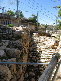 From there we walked up to the hilltop Tel Rumeida -- also known as the Jewish neighborhood, or settlement, of Admot Ishai, established in 1984. (Its residents consider it a neighborhood and a legitimate Jewish habitation in a city where Jews have lived for centuries; they wouldn't call it a "settlement." Others, of course, disagree.) It consists of several small yellow-painted low buildings which were initially intended to be temporary; there is a small playground; there is an IDF military base; and there are exposed sections of an archaeological dig which reveal the original steps of the city of Hebron from about 4,000 years ago.