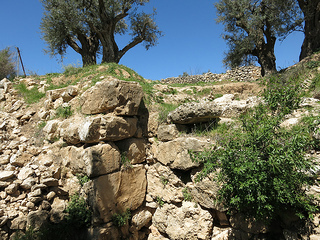 From there, a quick detour to see the small visible smidgen of a very ancient wall, even older than the original steps -- this is said to be the wall of enormous blocks which the scouts witnessed and, terrified of the giants who must have built it, retreated back to tell the other Israelites that they couldn't possibly conquer this land. (That story can be found in Torah in parashat Shlakh-Lekha.) Above this wall stands an olive orchard, and because that orchard is Palestinian-owned, no archaeological digging can take place there -- though it is believed that behind the wall, beneath the trees, are more remnants of ancient Hebron.