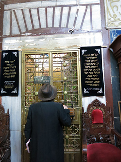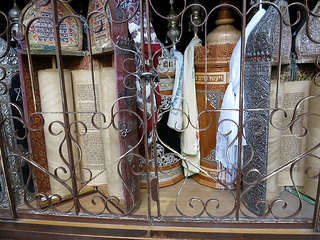During the time when Hebron was under Jordanian control, the synagogue of Avraham Avinu was desecrated. One end became a public latrine; another end, a garbage dump; and in the middle, a sheep pen. The synagogue was rebuilt in 1981. Today it is once again a beautiful, clean, welcoming synagogue made of white stone with a domed roof and windows letting in the sunlight. And two original Torah scrolls which were saved have been restored to the aron kodesh -- we got to see them in their Sefardic standing cases; they are more than 300 years old, and they are beautiful.