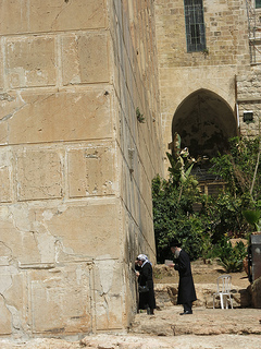 Around me I hear the clamor of voices, mostly speaking Arabic, which I do not understand. Occasionally I hear a snatch of Hebrew, mostly from the visibly-Jewish passers-by, the men in black frock coats with peyos and hats, the women with their hair wrapped in scarves who push strollers and lead little ones by the hand. The streets are narrow; there is barely enough room for the occasional car which creeps through, horn blaring when the foot traffic gets in its way.
