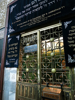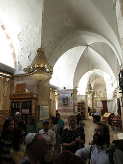Eliyahu told us the story of how the caves themselves (actually a cave-within-a-cave -- the name Machpelah means "doubled") was actually discovered beneath the building, and how there were indeed bones in the interior of the cave. Some photographs were taken, some maps were drawn, and then the caves were sealed permanently, because the site is too politically hot to be allowed to be accessible. And then, behind grilles and curtains, we saw the monuments to Abraham and Sarah and their descendants.