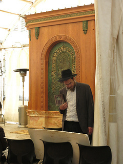 The Jewish side of the building; a man in the small tent-covered sanctuary.