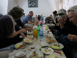 Mohammed was both charming and impassioned. He took us directly to a Palestinian home where we were graciously welcomed for lunch. We sat on couches alongside low tables in a whitewashed room decorated only with calligraphy quotations (I assume from the Qur'an), and a man and his wife provided us with a delicious meal of noodle soup, chicken and rice, cucumber-tomato salad, hummous and pita. I regret that I have forgotten the man's name, though his wife was named Sahour. Their little girl Malak ("Angel") was one of the sweetest kids I've ever seen; she sat right next to me, I showed her photographs of my son on my phone, and she beamed at me. (Later I showed Sahour the same photographs and we smiled at each other, one mama to another.)