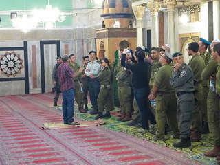 From there we returned to the building over the Cave of Machpelah, this time from the Muslim side, to see the Al-Haram al-Ibrahimi, the Ibrahimi mosque. (Jews are technically not allowed into this prayer space; I neglected to mention that I am a Jew, and the IDF guards didn't ask.) A group of Israeli soldiers arrived on some kind of training tour, and rattan rugs had been laid down so that they could walk without taking off their boots. (Everyone else in the building had taken off their shoes, as is customary when entering Muslim holy space.) Mohammed fumed that this was a clear sign of their disrespect for Islam. One of the soldiers stopped to argue with him about it, but he was clearly not mollified. To him, the soldiers in their combat boots blithely walking into his holy space were just another microaggression in a lifetime of Israeli aggressions.