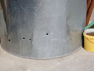 Rooftop tank with bullet holes.