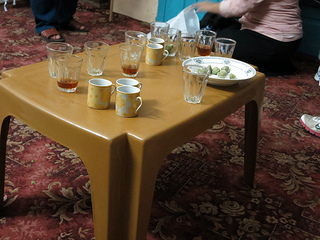 After a tour through the shuk (which was by and large similar to last time I was there, though I couldn't help noticing that both the merchandise and the shoppers were quite sparse, compared with other marketplaces I visited in Akko and Jerusalem) our last stop was a second Palestinian home. There we were welcomed by our second host, and we sat for a while in a comfortable living room draped with embroidered goods made by his wife. We drank hot tiny cups of cardamom-spiced coffee or mint tea, and ate green almonds which were distributed, with many giggles, by a three-and-a-half-year-old boy wearing a Spiderman shirt which my son would surely have coveted.
