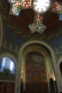 Then she took me to see one of her favorite places in Jerusalem, an utterly spectacular church on the far side of the Old City. It's called St. Peter in Gallicantu, and the name denotes the cock crowing -- as in the story of Peter rejecting Jesus three times before the rooster could announce the morning. I didn't manage to get any great photographs of it, so the one above will have to stand in. The interior mosaics which cover the dome and its pillars are incredible: a soft rainbow of colors, a ring of angels bearing trumpets whose robes resemble clouds. And although there was a tour group there when we arrived, we sat quietly off to the side and in time they departed and left us alone in the basilica, which was quiet and peaceful in a way I rarely associate with this city! The church was serene and I said a silent prayer that real peace may come speedily and soon to this place where so many people for so many centuries have sought connection with God.