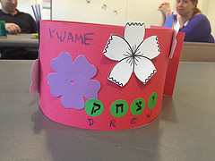 A paper-flower crown for Shavuot, featuring three of our son's four names.