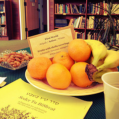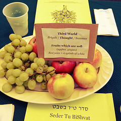 I abbreviated our adult haggadah a little bit -- some of the little kids (including mine) were running gleefully around the building, others were sitting at the table but not necessarily paying much attention, and I could tell we didn't have the focus for everything in there! Still, it was lovely. One of my congregants read the Marge Piercy poem about Tu BiShvat which I love so much. Others took turns reading little explanations of the four worlds. We blessed and drank, blessed and ate.