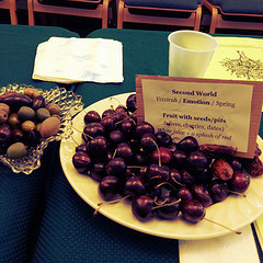 I didn't expect a big crowd for Tu BiShvat. I set up two tables and assumed that would do. Instead we had four tables' worth of people! We had to keep pulling tables out of the storage room and hastily adding them to the line. Some folks probably came because this is the first Shabbat potluck we've had in 2013. Others probably came because they were interested in Tu BiShvat. There's no telling what made each person or family decide to show up on this very cold Berkshire night, but I'm glad they did.