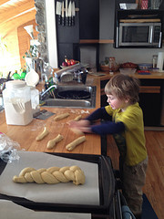 While the smaller challot are baking, we read It's Challah Time! -- a longtime favorite -- and he takes obvious pleasure in being able to say, "I did that!" every time we come to a step in which he participated.