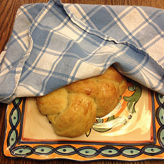 Once the first batch is out of the oven, I say hamotzi and we share a little challah roll. It's delicious: light and fluffy, tearing apart like the dinner rolls they used to serve at the Barn Door when I was a kid.