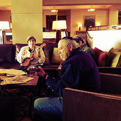 The obvious place to go, for low-key hanging out instead of the kind of brain-engagement required by another conference session, is the area of the lobby with the fireplaces and the couches. (I remember playing there with 13-month-old Drew two years ago.) And when I get there, I find a wonderful surprise: a group of friends singing by the fire. So I sit down at the edge of the hearth and soak up the warmth of the fire and the warmth of their music, sometimes humming or singing along.