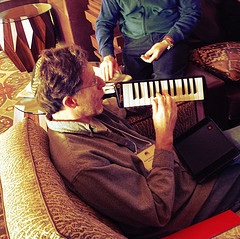 While I'm there they sing niggunim, secular songs ("Me and Bobby McGee"), Yiddish songs ("Shnirele Perele") extemporaneously rendered in English, lines from liturgy set to new melodies. More instrumentalists join the group. By the time I regretfully walk away -- wanting to stay, but also wanting to catch one of the sessions in the next slot -- there are two guitarists, three ukelele players, and one rabbi playing a keyboard harmonica.