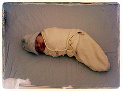 No one can treasure everything. Maybe all we can really do is try to notice a few instants in every day, each one a single still in an unfolding slideshow. Click: tiny Drew in my arms, swaddled tight. Click: Drew lies at the foot of the crib, playing a kick-piano with his feet. Click: Drew sleeps peacefully in the crib, limbs akimbo. A moment is here and then gone, tucked into memory like a flower petal into a book.