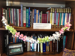 I also really like the way it looks, adorning this bookshelf in my office. There's something festive about all of the tissue-wrapped candies -- they remind me of tissue-paper flowers, which in turn, at this time of year, make me think of the tissue-topped cascarones and the tissue paper flowers of Fiesta, which falls during the Counting of the Omer each year in the city of San Antonio where I grew up. (I've written about the confluence of Fiesta and Pesach before -- five years ago, in the post Almost here.) It'll almost be a shame to take this apart as I count...