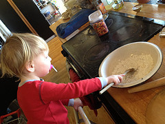 The recipe is very simple -- you can find it in my 2004 post Hametz and matzah. The ingredients are really just flour and water. (I meant to add a bit of salt this time, but I forgot. Whoops.) I measured out the flour and the water from our well and set the oven to preheat. Once it was hot, I asked if Drew wanted to help. He was a bit dubious, but when I opened up the step-stool and offered him a wooden spoon, he was intrigued enough to climb up and lend a hand.