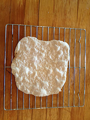 He enjoyed taking turns with me doing some of the stirring. I tried to interest him in rolling out the balls of dough with the rolling pin, but I think that was a bit sophisticated for two and a half; he poked at the dough a bit with the rolling pin and then announced "all done!" So I released him to play with his toys while I finished the matzah. I was on a deadline, after all; no more than 18 minutes could elapse between the moment when water hit flour, and the moment when the matzah entered the oven.