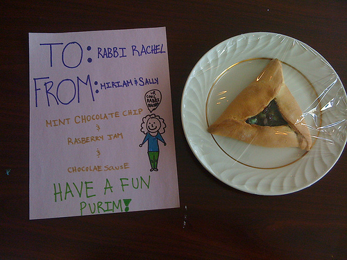 Among Purim's central traditions are the delivering of mishloach manot -- gifts of tasty snacks given to friends -- and the giving of food, or money for food, to those who are hungry. The hamentaschen made by our youth group kids were intended to enable them to fulfill the mitzvah of sending mishloach manot. Apparently they also made a few special extras -- like this one which awaited me when I arrived at the synagogue this morning.