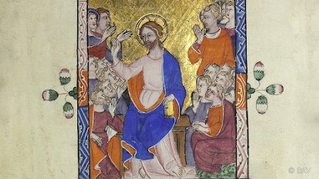 En la tarde de aquel día, el primero de la semana, yestando los discípulos con las puertas cerradas por miedo a los judíos, llegóJesús, se puso en medio y les dijo: «¡La paz esté con vosotros!».