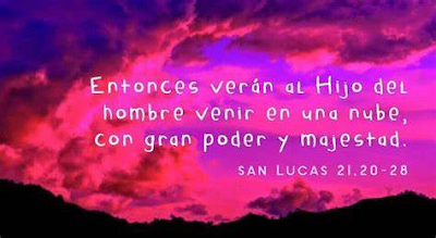 Habrá signos en el sol y la luna ylas estrellas, y en la tierra angustia de las gentes, perplejas por elestruendo del mar y el oleaje, desfalleciendo los hombres por el miedo y laansiedad ante lo que se le viene encima al mundo, pues las potencias del cieloserán sacudidas. Entonces verán al Hijo del hombre venir en una nube, con granpoder y gloria. Cuando empiece a suceder esto, levantaos, alzad la cabeza; seacerca vuestra liberación.