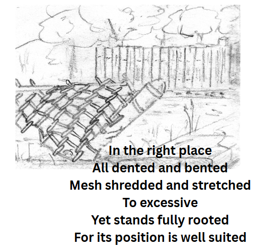 So, what does this poem mean? It means I saw a mangled fencepost, sketched it, then thought it would be a good was to use the made up word “bented.”