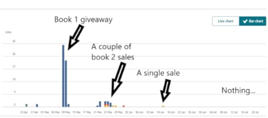 In May, I decided to give book one of my trilogy away, hoping that sales of books two and three would increase, but those did not transpire. I then put them back into Kindle Unlimited to see if that might kickstart some page reads.