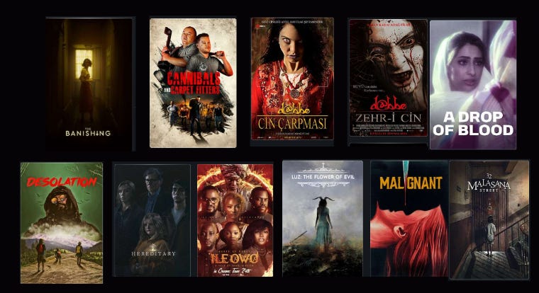 THE EMPTY MAN (2020) dir. David Prior – a bit on the nose, this one, given the pandemic year, as the danger comes from the Himalayas and is brought back to the USA. It then gets esoteric and New Age-y and things go to shit. Police procedural with urban legend horror in the mix.THE SONATA (2018) dir. Andrew Desmond – this really belongs in Family Horror, but I’m sticking it here because the family element is the catalyst for the plot and the weird demonic cult stuff is the main mystery. It contains a trope I love: music as a language, and in this case, a language capable of breaking down barriers between worlds.DÈMONI/Demons (1985) dir. Lamberto Bava – Italian film where people get trapped in a West Berlin movie theatre as the demon apocalypse begins. Body horror, very much like a zombie film, but where demons later break out of the zombified bodies of the possessed. Amazing punk aesthetic. Back in the good old days where you could get a whole coke can of snow for about as much as a multipack of quavers.DÈMONI 2: LI’INCUBO RITORNA/Demons 2 (1986) dir. Lamberto Bava – a decent sequel, this time in an apartment block, with Asia Argento (Dario Argento produced it). Crossover cast in different roles, so keep a look out for familiar faces! Again, very zombie-like, but in this one you get to see more of the demons hatching from the possessed husks.LA CHIESA/The Church (1989) dir. Michele Soavi – Italian horror set in a Gothic cathedral, with body horror and giallo vibes, not a sequel to Bava’s Demons but it really could be part of a triple bill with those two films. I watched it first, and that felt like the right order to me.THE RITE (2011) dir. Mikael Håfström – I preferred this to The Pope’s Exorcist, I think. Anthony Hopkins did a great job, and I always like to see Welsh being used in mainstream cinema.THE POPE’S EXORCIST (2023) dir. Julius Avery – it was fine. I hope the sequel they are threatening us with has something else to it, because otherwise it’s the same story in a different location, and we have innumerable versions of this story already. For something a bit more subversive and slightly different on this theme, try the Polish film, Hellhole/Ostatnia Wieczerza (2020).제8일의 밤/The 8th Night (2021) dir. Kim Tae-hyoung – Korean action horror which I really enjoyed, where a monster’s eye possesses people to get back to its other eye and raise the monster. I’ve put this in here as an ‘apocalyptic’ type scenario, only in a Buddhist context so not in the religious sense of the word but in an ‘impending doom’ sense.Hauntings & CursesI’ve covered the jinn films and quite a lot of the haunted houses in the Family Horror section above, but they are also in this genre too! So here are the films where either family is not central to the plot or theme, or the protagonists are not a family.
