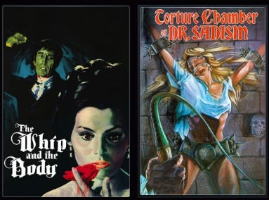 LA FRUSTA E IL CORPO/The Whip and the Body (1963) dir. Mario Bava – psychological, psychosexual kinky Gothic Romance with murder and sexy whipping times. It has everything you could want from a classic 18th/early 19thC Gothic novel, but in glorious Technicolour. If you want melodrama, hysteria, mouldering corpses, mysterious and possibly supernatural murders, insanity, so many overlapping love triangles, a suicide backstory, a messed up family with secrets, and a lot of kinky whipping and bodice-ripping, this is for you.DIE SCHLANGENGRUBE UND DAS PENDEL/The Torture Chamber of Dr Sadism (1967) dir. Harald Reinl – melodrama on steroids. Ignore the English title, he’s a Count, not a doctor, but there is a bit of mad science involved in his resurrection. Also magic. Magical Science. I really enjoyed it, to be honest. It’s a lunchtime film, where you can just stick it on and appreciate the highwaymen, the haunted forest, the ‘fear-inducing’ castle maze complete with both pit and pendulum of the original German title, the side character romance, the convoluted vengeance, the costumes, more hysterics, some snakes… It has it all.