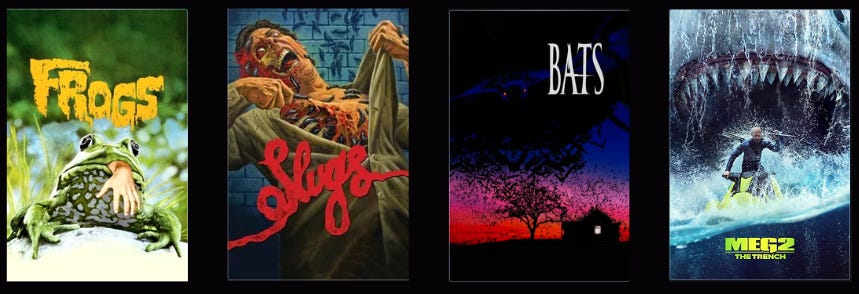 SLUGS (1988) dir. Juan Piquer Simón – anxieties about genetic mutations with pollution as a cause (iirc), but it’s an exploitation film with all kinds of gnarly body horror, including the memorable explosion of someone’s face at a restaurant after accidentally ingesting a slug that infected him with parasites. Apparently not a soul knew that sodium chloride (salt) works on slugs, as nobody tries to salt them. They do come up with a dramatic lab chemical to elaborately destroy them all, though. A very 80s film, in the way FROGS feels very 70s.BATS (1999) dir. Louis Morneau – anxieties about animal experimentation and genetic modification, wrapped in a 90s blanket of fun family action thriller, led by a gorgeous blonde girlboss and her sassy Black (guy) sidekick, whose comic relief role is similar to other films of this genre/era, like in Evolution. Also as in a lot of these films, the bad guy is a scientist, and the other antagonist (due to stubbornness and unwillingness to listen to the experts) is the US Army General. It’s a case of the niche experts who get their hands dirty coming up against their superiors who are presented as mad, bad, or both, which is a specific kind of US American educated middle class against their superiors. Good Experts vs Bad ‘Experts’ on the eve of a new millennium full of scientific progress.MEG 2: THE TRENCH (2023) dir. Ben Wheatley – anxieties about a fucking big shark. Well, also, corporate corruption, disrupting the natural equilibrium, polluting and exploiting the ocean’s resources. I hadn’t been to the cinema in ages so I treated myself to an Everyman to see this, complete with sofas, table service, and a cocktail. Absolutely worth it. Just me, and the two gents behind me who apparently had a membership. Had a great time.